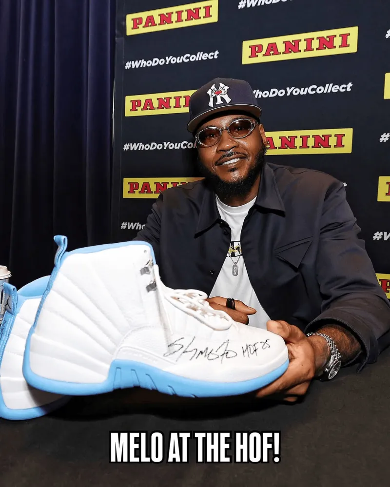 虎扑09月06日讯 今天,卡梅罗-安东尼在2025篮球名人堂粉丝活动中,为一名粉丝带来的Air Jordan 12“Melo”PE留下双签。